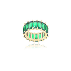 This Beautiful  eternity band is our original design, featuring a full circle of gleaming shared prong Green CZ's set around the entire ring. This ultra-thin multi Simulated emeralds band is the perfect complement to any engagement ring or to wear with stackable bands, and comes in yellow gold setting. You can't go wrong with this simple and classic choice as a wedding band or anniversary ring, especially for the woman who has more refined taste.
