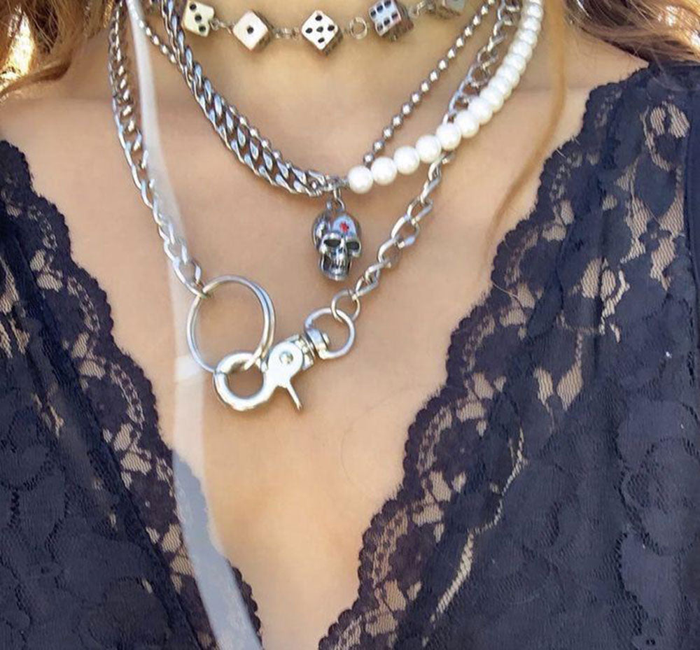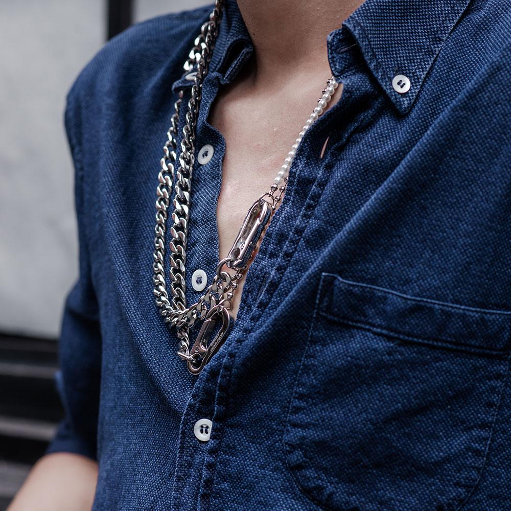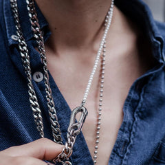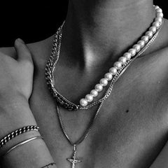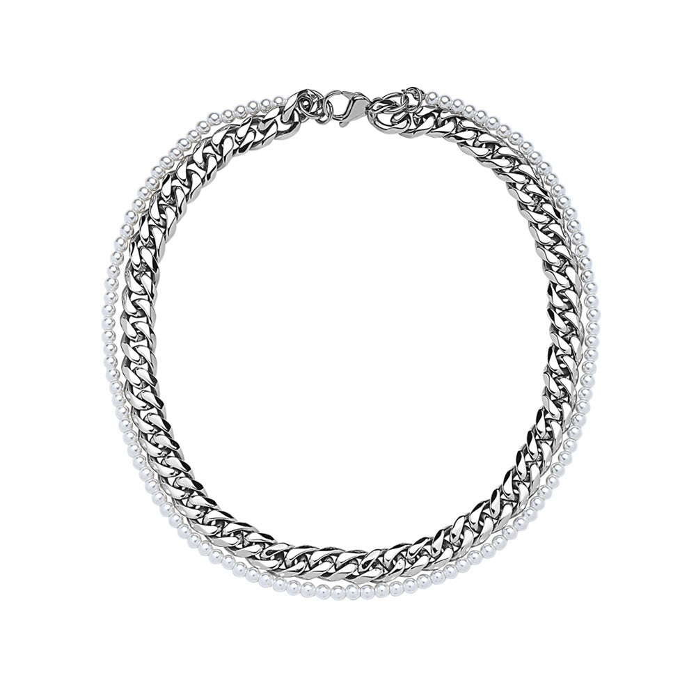 DOUBLE LAYER 5MM WHITE PEARLS AND 10MM CURB LINK CHAIN NECKLACE